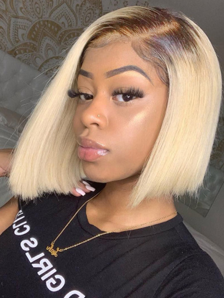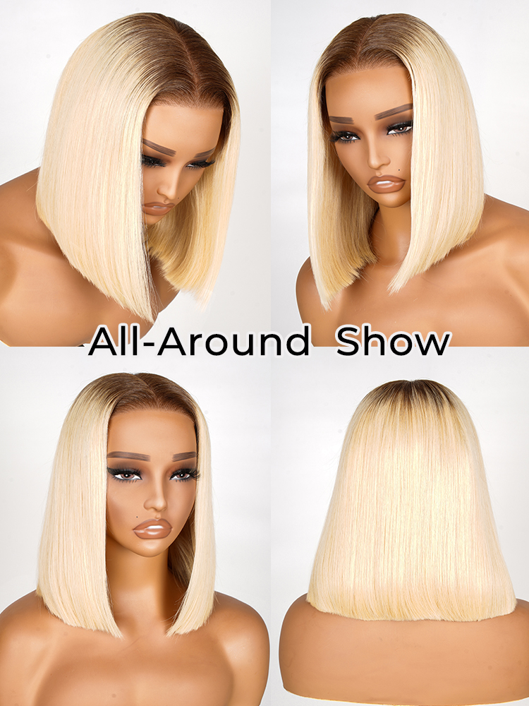 Alipearl #4/613 Blonde Straight Bob Wigs with Dark Brown Roots 13×4 Lace Frontal Wigs 6*8 Lace Closure Wigs With Drawstring Human Hair for Women Pre Plucked Natural Hairline 180% Density