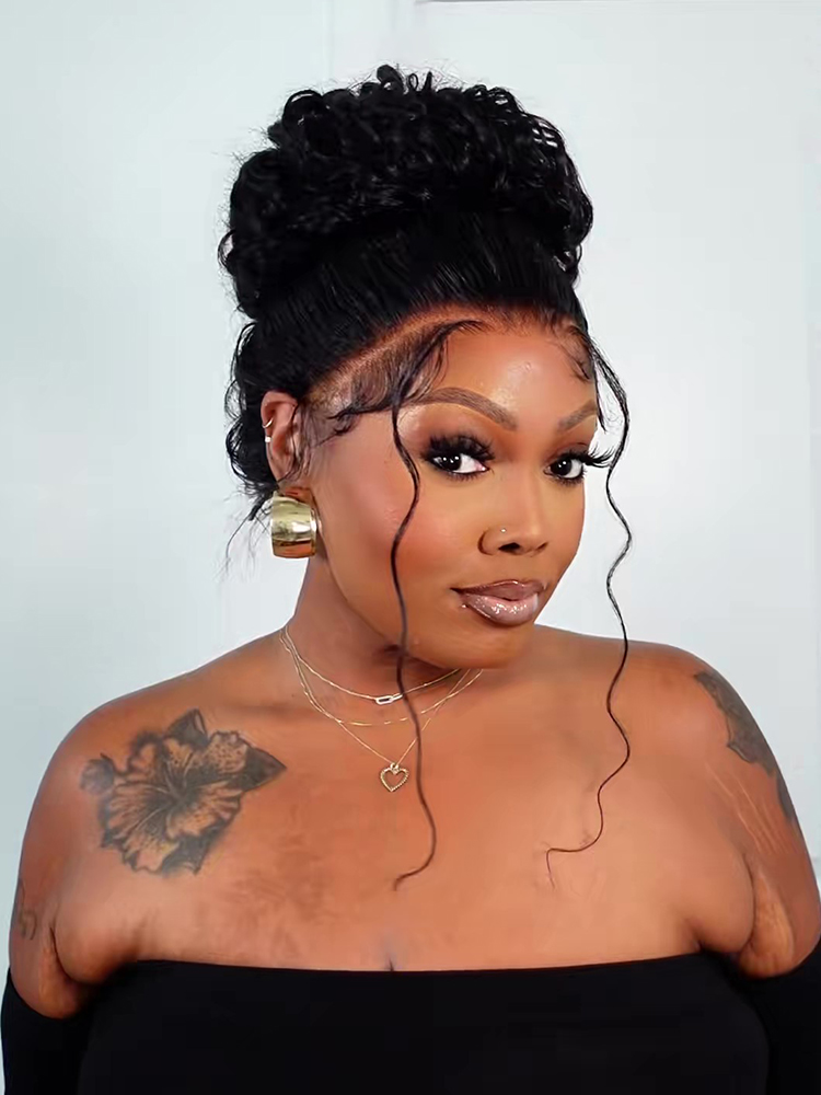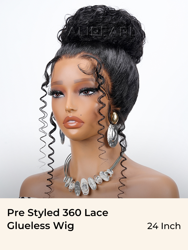 Alipearl 360 HD lace frontal wig in water wave hair, pre styled high bun look with baby hair, giving realistic look. Invisi drawstring can fit all head size. Try it now!