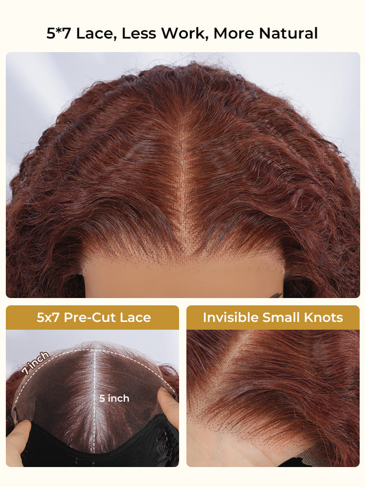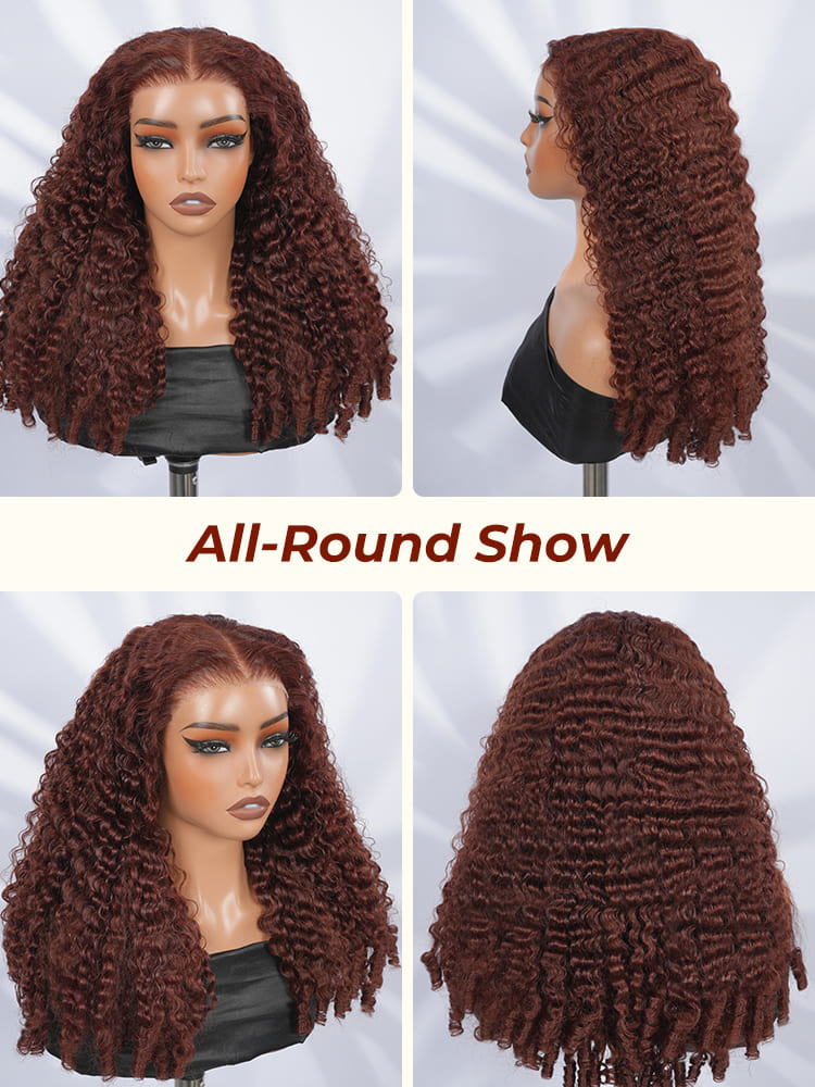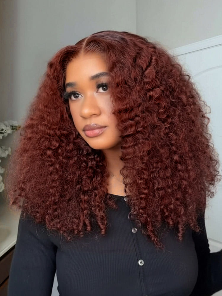 Reddish Brown Burmese Curly Wig With 5×7 Lace Ready To Go Design. Soft Defined Curls With Full Volume, Adjustable Drawstring For Secure Fit And Easy Everyday Wear.